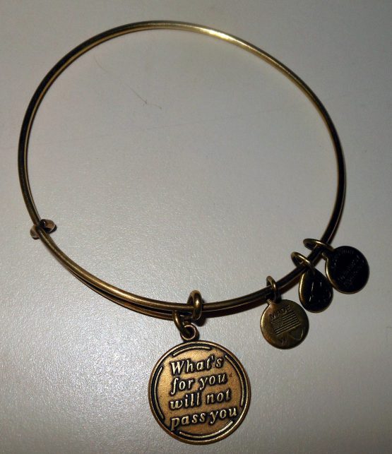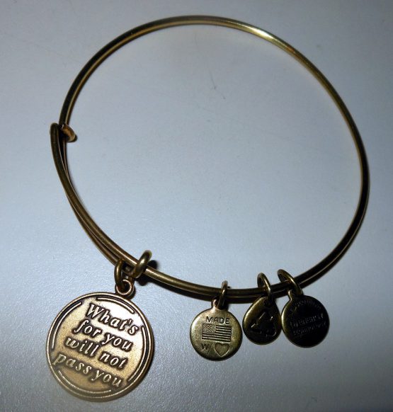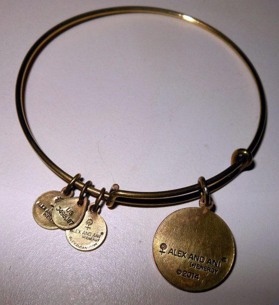 Hi, I am selling a, Guaranteed Authentic Alex And Ani Whats for You Will Not Pass You Charm Gold Russian Bangle Bracelet, In Excellent Condition. This is a beautiful authentic and retired Alex and Ani bracelet, with the Charm Whats for You Will Not Pass You, in gold. The bracelet is one size fits all, with an expandable system. Please look at all the pictures.