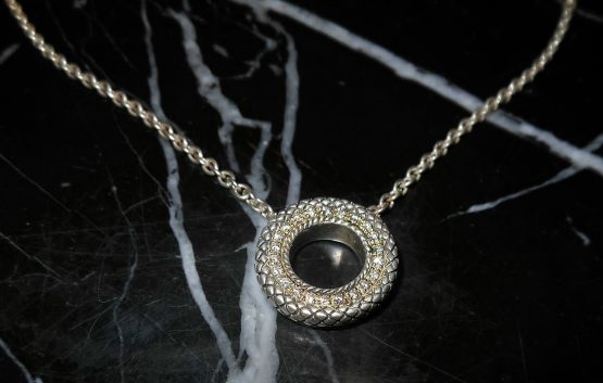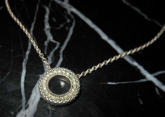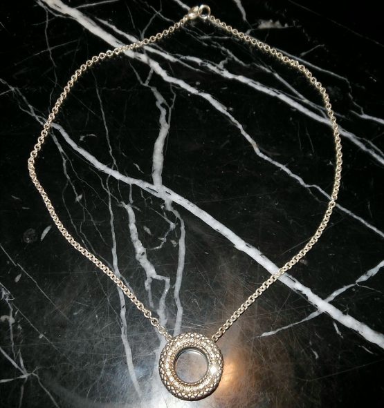 Hi, I am selling a, Guaranteed Authentic Andrea Candela Diamond 18k Gold & Silver Halo Design Circle Cable Necklace , In Excellent Condition. This is a beautiful authentic and rare necklace by Andrea Candela, with a donut shaped pendant, which has many details, like 18k gold, diamonds around the inside hole, and a stylish pattern that reminds of david yurman, which I personally really love. The measurement is 18 inches long, and weighs 11 grams. This beautiful piece of jewelry retails for $950, and comes with a free strawberry shaped gift box. Please look at all the pictures.