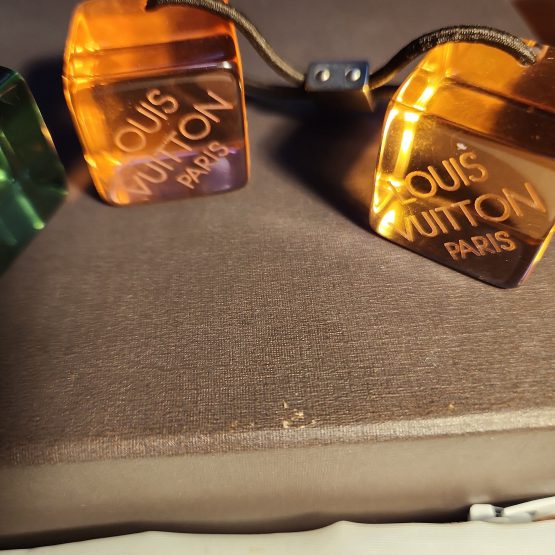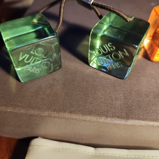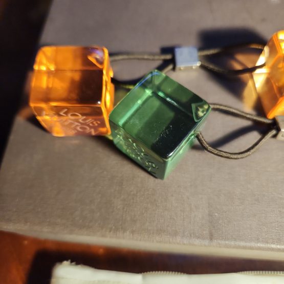 This is an authentic, rare Louis Vuitton inclusion resin cube hair tie in neon green & neon orange colored, comes with Louis Vuitton Bag, for women. This is a great collector’s piece for any Louis Vuitton lover. These gorgeous Louis Vuitton hair ties are lightly used and well taken care of, almost new condition. These Louis Vuitton hair ties, hard to find, and rare.