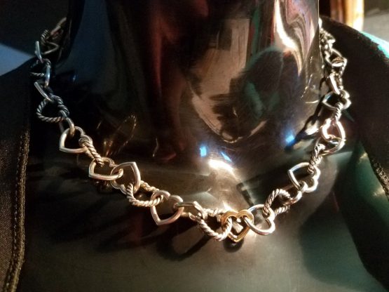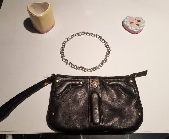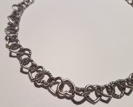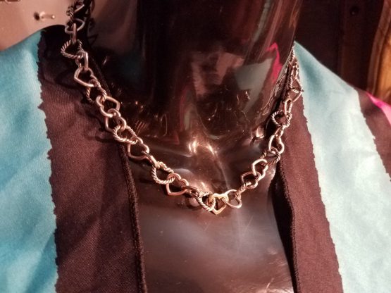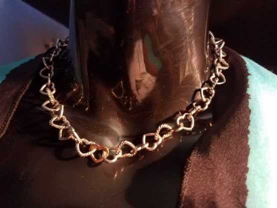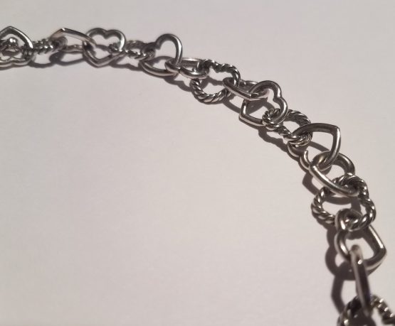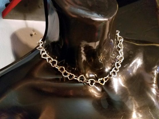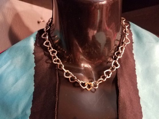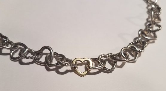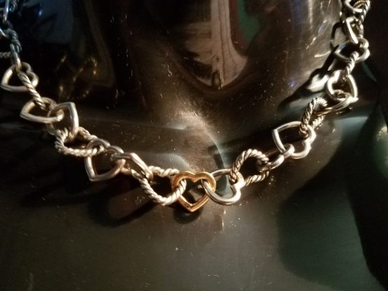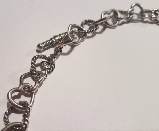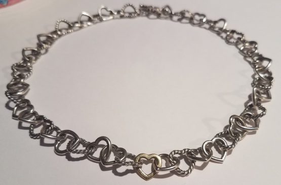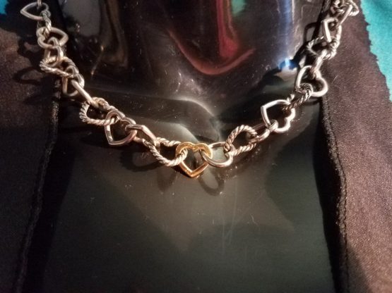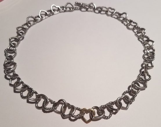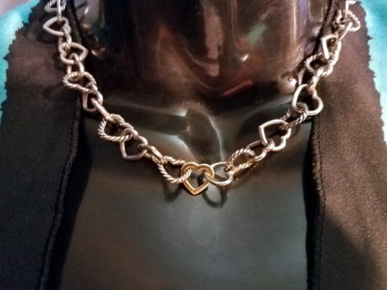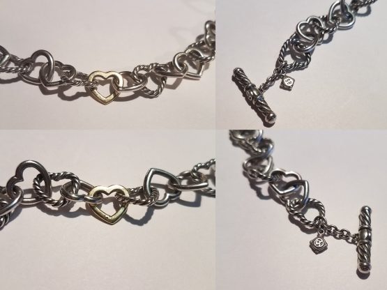 Hi, I am selling a, Guaranteed Authentic David Yurman Sterling Silver & 18K Yellow Gold Cable Hearts Necklace, In Excellent Pre-Owned Condition, this is a gorgeous piece of jewelry by David Yurman, from the David Yurman Cable Heart Collection. The necklace features interlinked sterling silver hearts, with a 14k gold heart in the center. It weights 36.1 grams, and is 15.75 inches long (40 cm). It has a toggle closure and bears the hallmark “D.Y. 750 925″ on the tag, including smaller hallmarks bearing the initials of David Yurman. Included in this sale are additional gifts, like a ceramic heart shaped storage compartment, which is in excellent condition. Furthermore this gift set contains a rare black wristlet, made by Juicy Couture in genuine smooth leather. The wristlet measures 8″ long, 5” high, and 0.5 inches deep, also in excellent pre-owned condition, no stains or damages, just gently used. The David Yurman necklace is in excellent pre-owned condition, has been professional polished, and is very shiny, has also no damages. Please look at all the pictures.