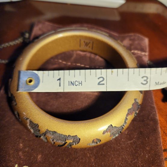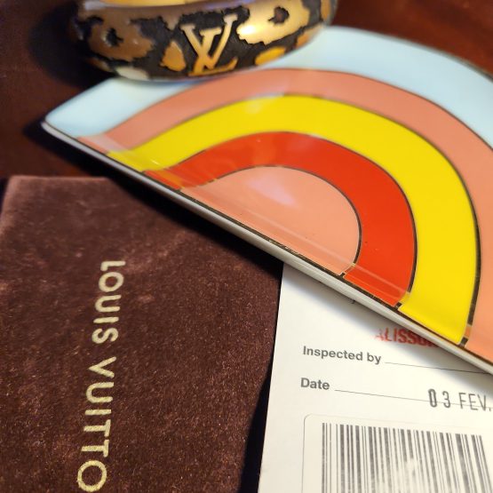 This is an authentic, rare Louis Vuitton bangle with Leo Monogram, Leopard or Jaguar style, made of wood, comes with Louis Vuitton Bag, for ladies. This is a great collector’s piece for any Louis Vuitton lover. This gorgeous Louis Vuitton bracelet is lightly used and well taken care of, almost new condition. Comes with a certificate of authenticity from Vestiaire Collective. This Louis Vuitton bracelet is hard to find, and rare.