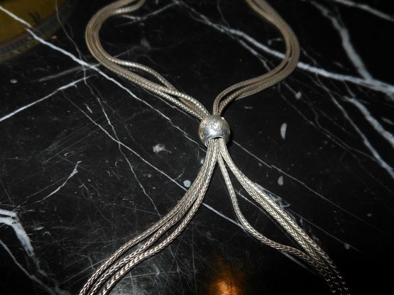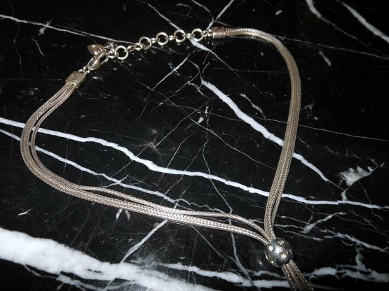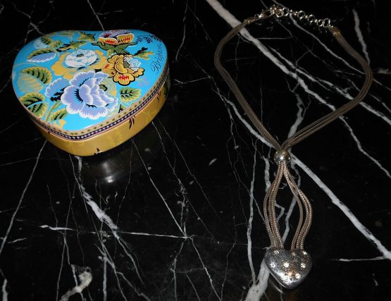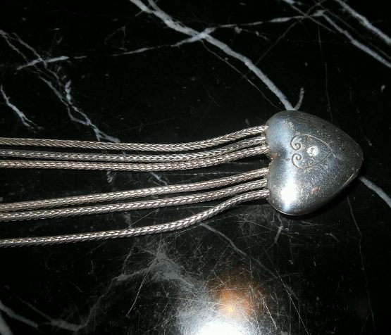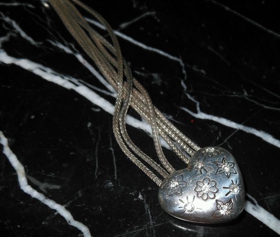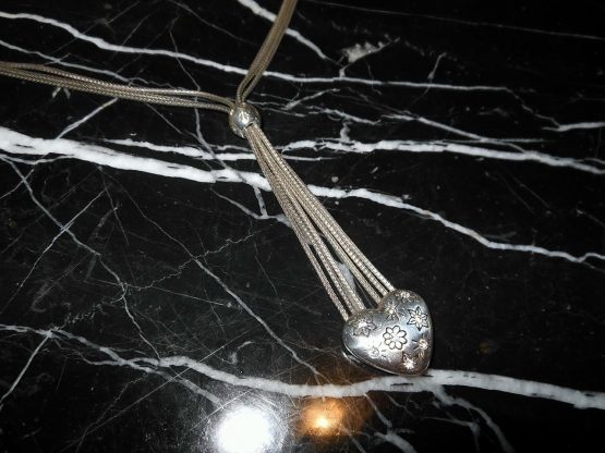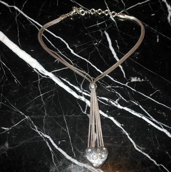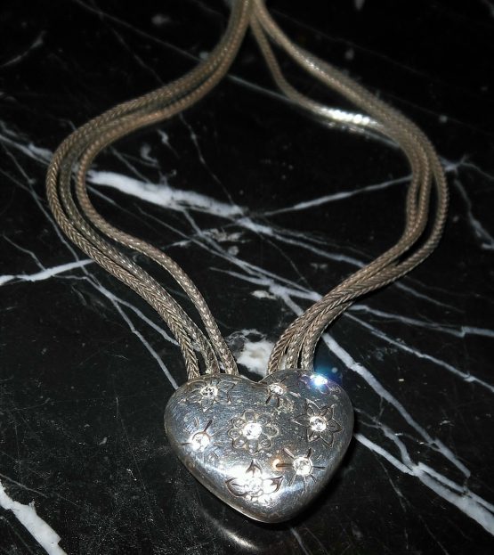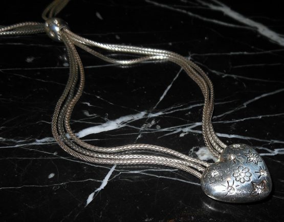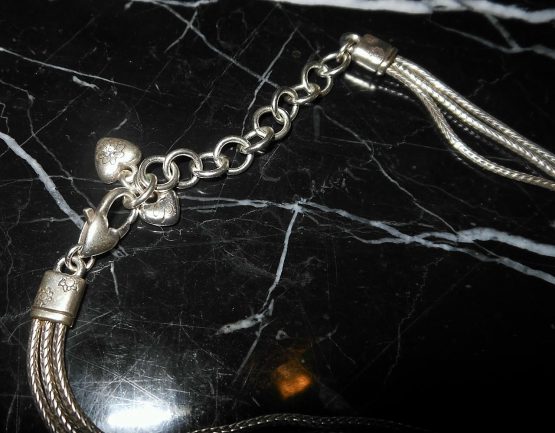 Hi, I am selling a, Guaranteed Authentic Brighton Necklace Crystal Heart Reversible Multi Chain Slider Silver Retired, In Excellent Condition. This is a gorgeous heart chain necklace by Brighton, which is a retired design. The necklace is silver tone, and either silver plated as most Brighton jewelry, or sterling silver. The heart pendant has several crystals on one side, and one in them middle on the other side. It has a reversible design, so both sides of the heart pendant can be used, and also it features a multi-chain design that allows to wear it in different styles by sliding the piece up and down. The measurements of the chain is 10.5″ inches long and weighs 34 grams. Comes with the original Brighton gift box. The condition is excellent, silver is shiny, however it has some tarnish on the heart if looked at very closely, otherwise not noticeable and has no damages, and looks great. Please look at all the pictures.