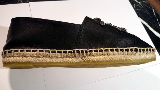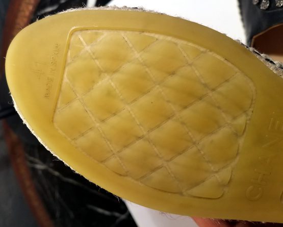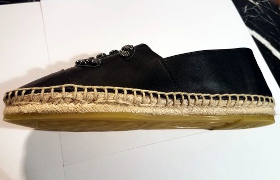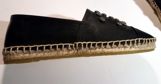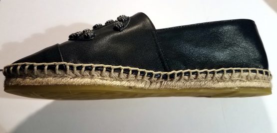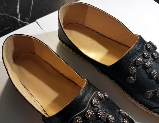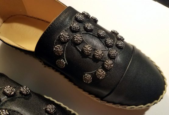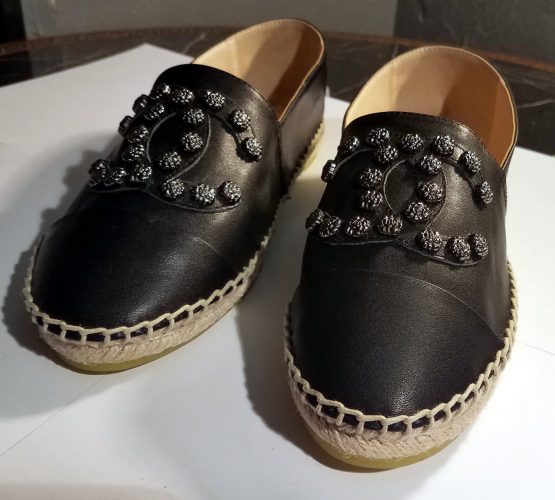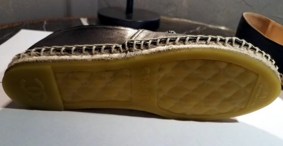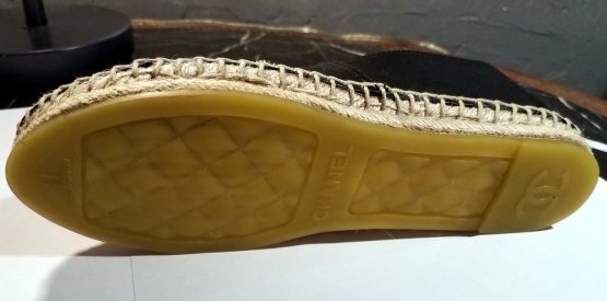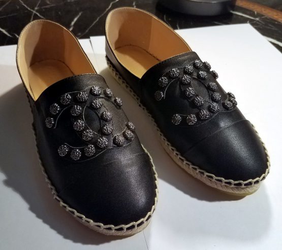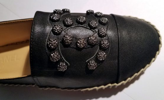 Hi, I am selling a, Guaranteed Original Chanel Espadrilles Black Lambskin Leather With Camellia Studs Size 41 Very Nice!, In Like New Condition, these are a gorgeous pair of Chanel shoes, made in Spain, the lambskin is very subtle, and the details on the Camellia flowers forming the Chanel Logo, also high quality craftsmanship. I was giving these shoes as a gift, and they were bought in Miami. Also, this is sale only includes the shoes, no box or dust bag. The condition is excellent, the shoes have been used very few times, and are very clean. The shoes have no damages, and are almost brand new. Look at the pictures