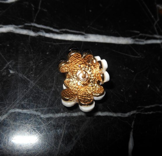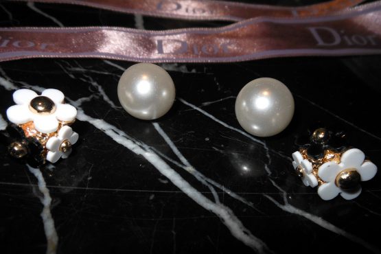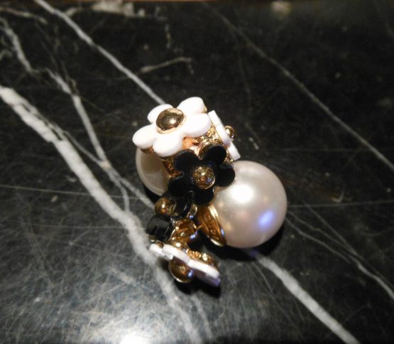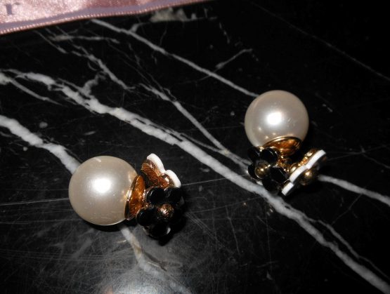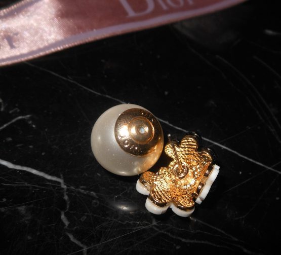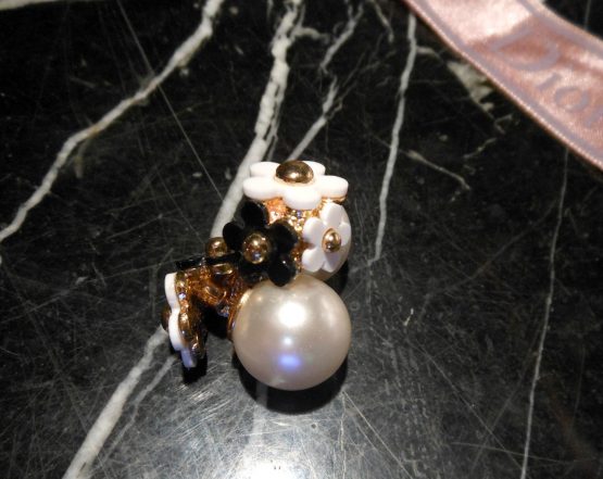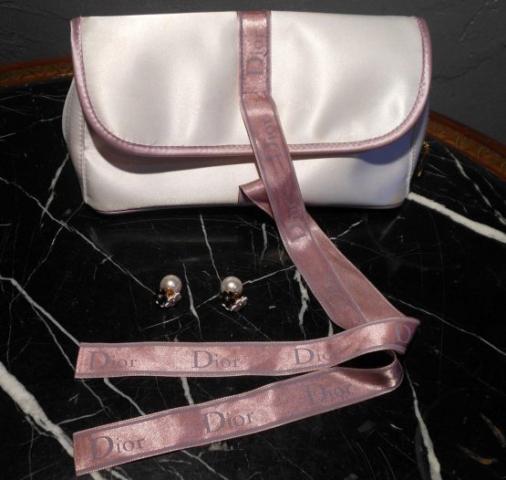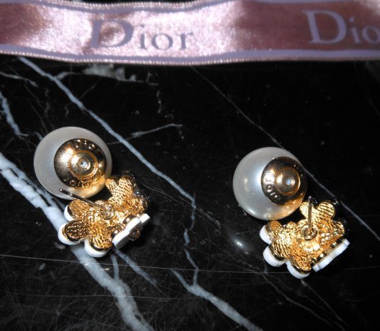 Hi, I am selling a, Guaranteed Authentic Christian Dior Mise En DIOR Tribal Earrings White Pearls Black Flowers Gold + Gift, In Excellent Condition. This is a gorgeous pair of authentic and very rare style Christian Dior Mise En Dior Tribal Earrings, with 3 flowers black and white in gold earrings back. The earrings backs are push on. The Dior earrings measure 1 inch in length with the earrings back on, and 0.675 inches in (width) diameter, also the diameter of the pearls. These earrings retail for about $700. The included gift is a Christian Dior Travel Bag, with a satin white fabric, that is easy maintained, and a zippered main purse, with another zip side pouch, including a ribbon and magnet closure, measuring 11″ in length, 6″ tall, and 3″ wide. The condition of the Dior earrings are like new, they have no damages, or anything that is noticeable upon inspection, and really look like new. The Dior Travel Bag has one stain on the inside as pictured, and one yellow discoloring barely noticeable on the front flap bottom right. Please look at all the pictures.