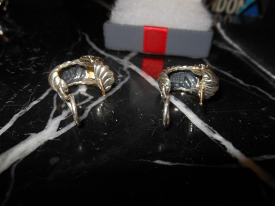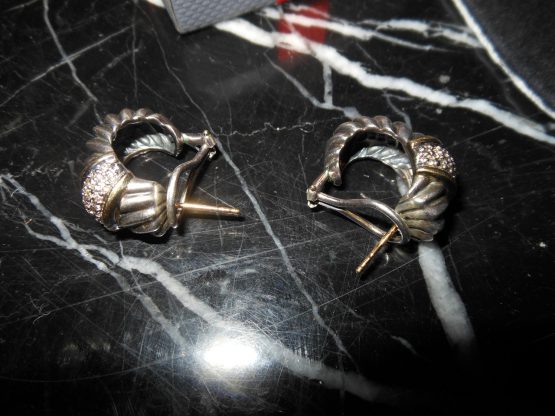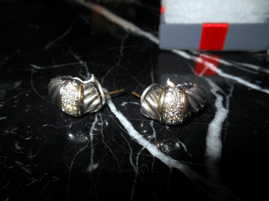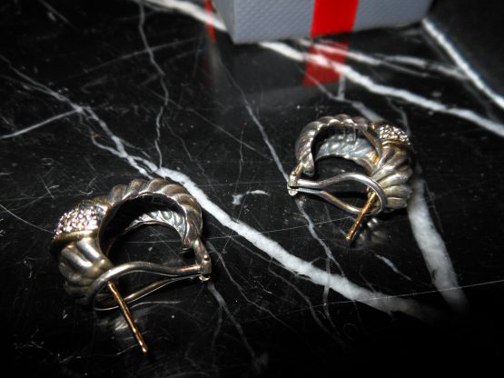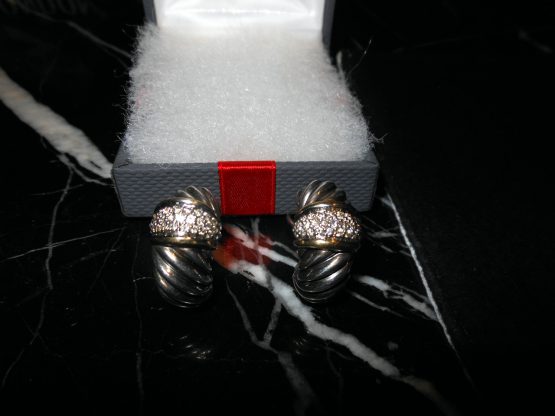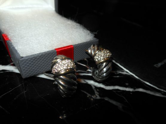 Hi, I am selling a, Guaranteed Authentic David Yurman Diamond 18k Yellow Gold Sterling Silver Shrimp Earrings, In Excellent Condition. This is a rare and retired gorgeous earring set by David Yurman, in 18K Yellow Gold and 925 Sterling Silver, Shrimp Style. The earrings are made from Silver and and 18KT Yellow Gold. They hold 21 Natural Rounds cut Diamonds that add up to approx. .31ct and weights 13.7grams. Hallmarked 750,925, D.Y. These earrings are in excellent condition, no visible damages, look beautiful, and comes with a David Yurman Dust Cloth, and a gift box. Please look at all the pictures.