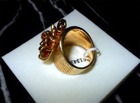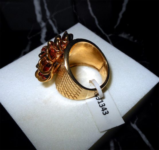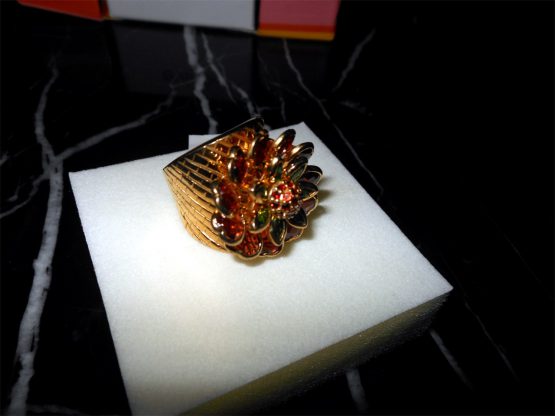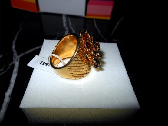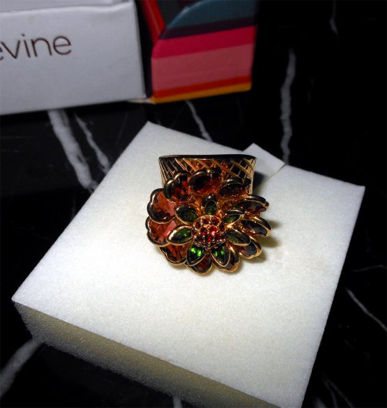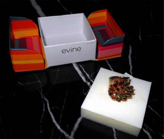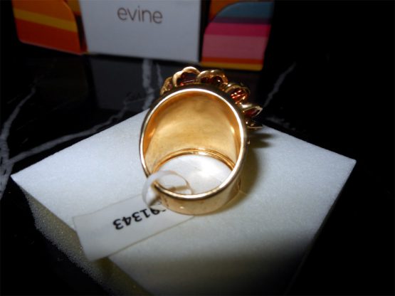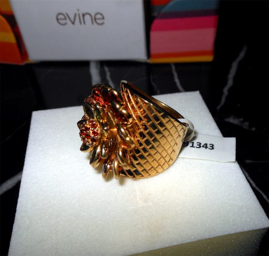 Hi, I am selling a, Guaranteed Authentic Evine Spinner Gold Plated Sterling Silver Women Flower Ring Gemstones Size 8.5 NWT, In New With Tag Condition. This is a gorgeous gold spinning ring with gemstones by Evine. The ring is stamped 925 STS, and considered sterling silver with gold plated, size 8.5, the spinner is double which means two rows are spinning. Also, there are several gemstones. The measurement is 1 inch long, and 1 inch is the diameter of the spinning top, the width is 3/4 of an inch, it weighs 16 grams. Please look at all the pictures.