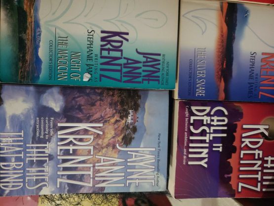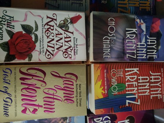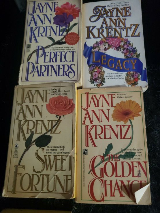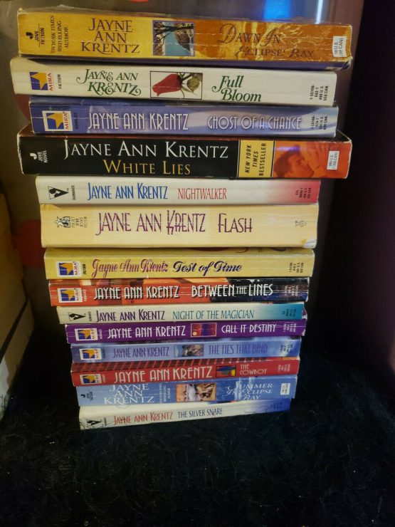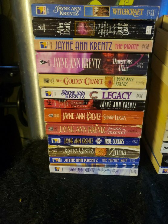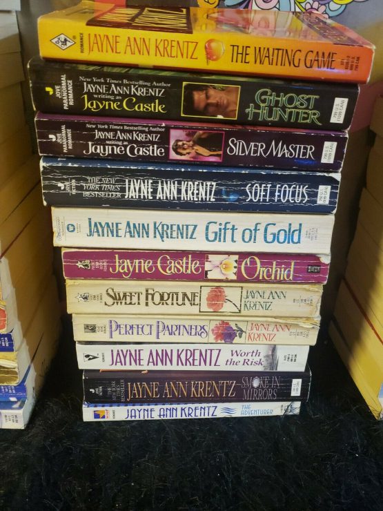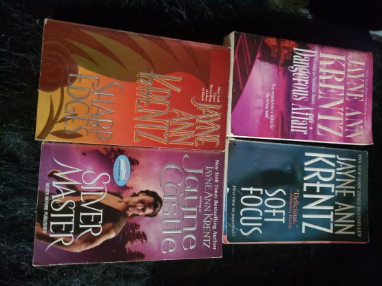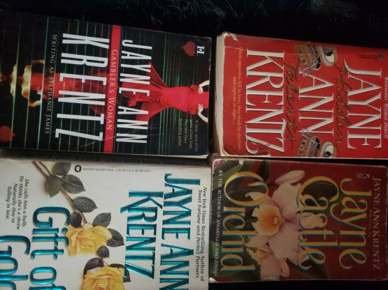 Book titles: Worth the Risk, Smoke in Mirrors, After Dark, Dawn in Eclipse Bay, Flash, Ghost Hunter, The Adventurer, The Pirate, Witchcraft, Nightwalker Collector’s ED, The Silver Snare, Night of the Magician, The Ties that Bind, Call it Destiny, White Lies, The Waiting Game, Between the Lines, Summer in Eclipse Bay, Ghost of a Chance, Full Bloom, Test of Time, The Cowboy, Perfect Partners, Legacy, Sweet Fortune, The Golden Chance, Dangerous Affair, Sharp Edges, Soft Focus, Silver Master, Hidden Talents, Gambler’s Woman, Gift of Gold, Jayne Castle Orchid, The Wedding Night, The Family Way, True Colors, Zinnia