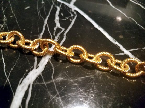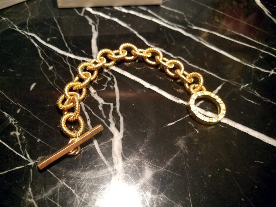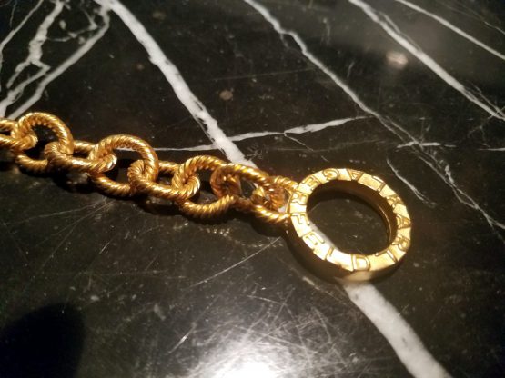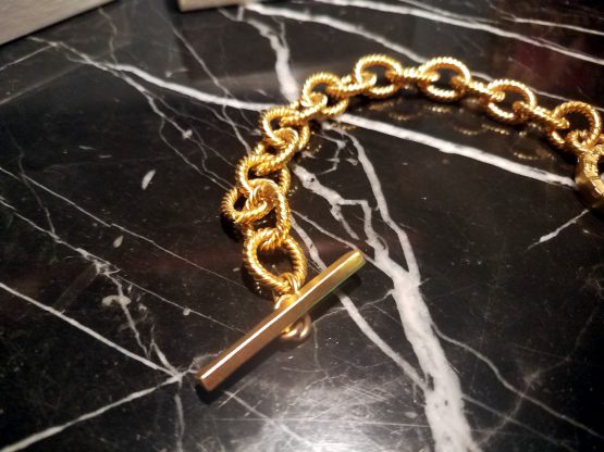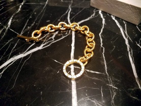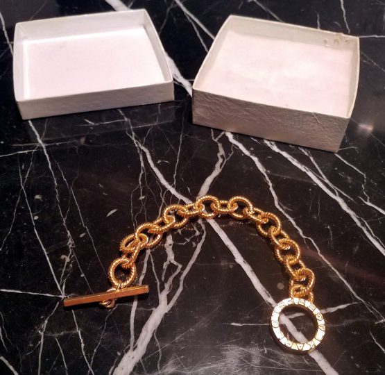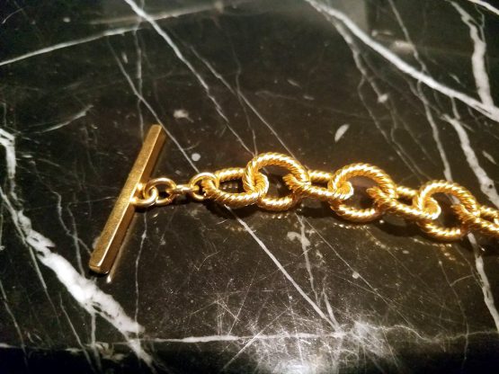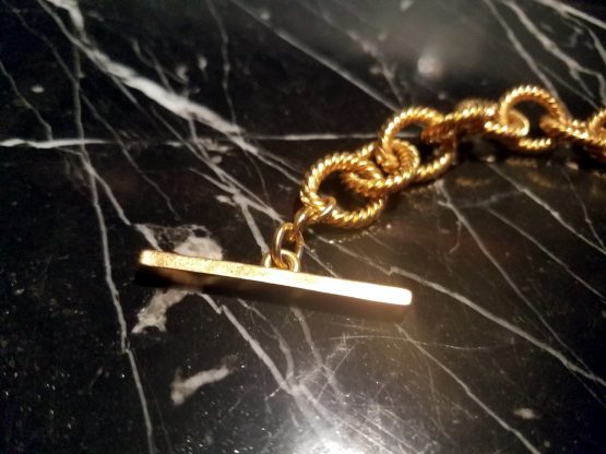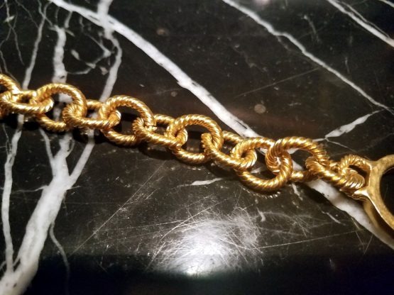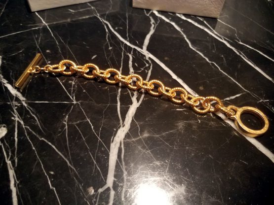 Hi, I am selling a, Guaranteed Authentic VTG KARL LAGERFELD CHANEL Designer Bracelet Chunky Chain Logo Toggle Clasp +Bonus, In Excellent Condition. This is a gorgeous statement piece, chunky gold chain bracelet, by Karl Lagerfeld, in shiny gold, with Karl Lagerfeld written around the toggle, also it has a toggle clasp. The measurements of the bracelet are 7.5″ inches long and weighs 29 grams. Comes with a Karl Lagerfeld Perfume, that is still full, but had been opened, comes with the box. The condition is excellent looks great, gold is shiny, has minimal scratches. Please look at all the pictures.