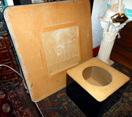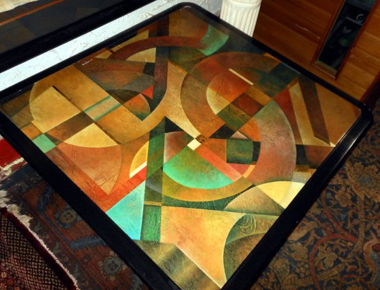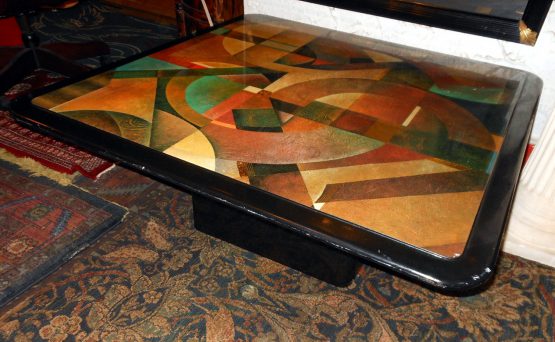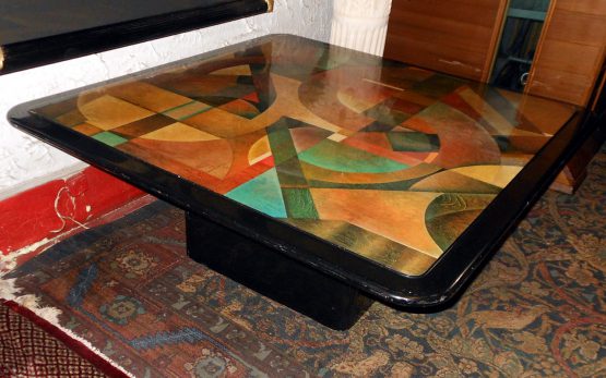 Hi, I am selling a, Guaranteed Authentic Laminate Geometric Modern Design Coffee Table Black Laquer 42 x 42 x 15, In Very Good Condition. This is a large coffee table with a modern geometric design, the design is laminate like formica, and the wood is black laquer. It has round corners and a round base, really unique and beautiful piece of furniture. The piece can be taken apart, for easy transportation, as two separate parts. The measurements for the entire piece are 45 inches wide and long, by 15 inches high. Please look at all the pictures.