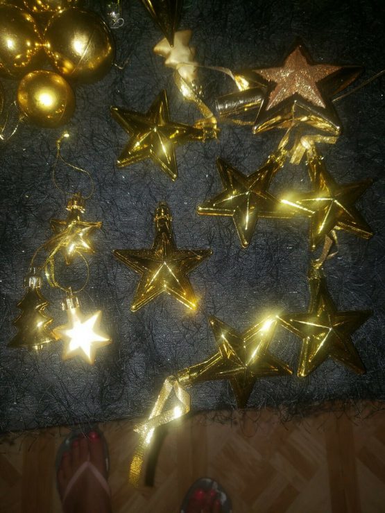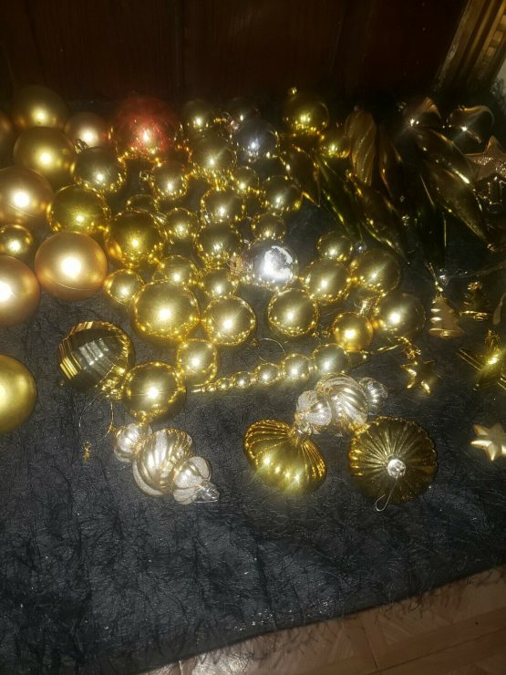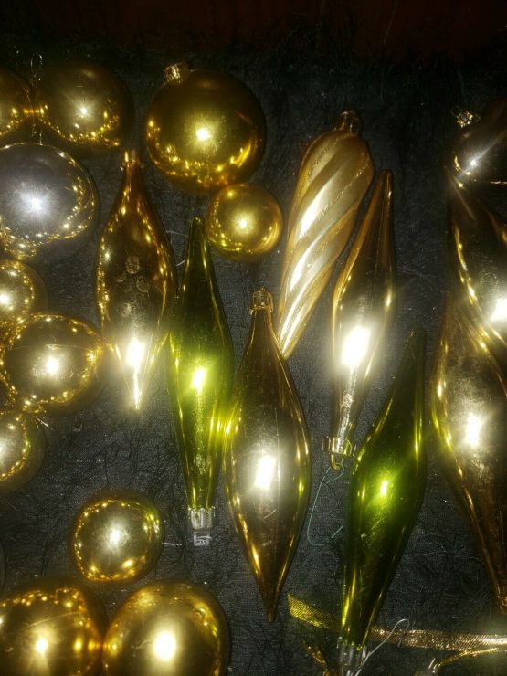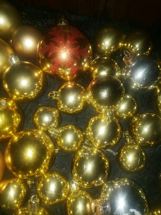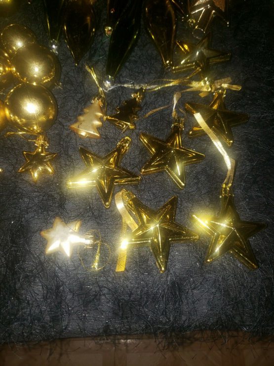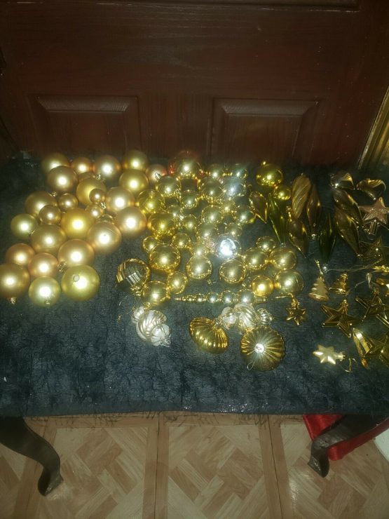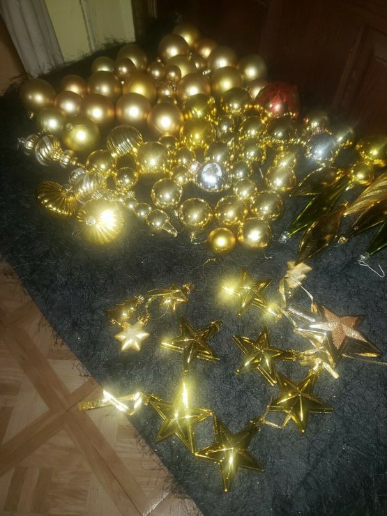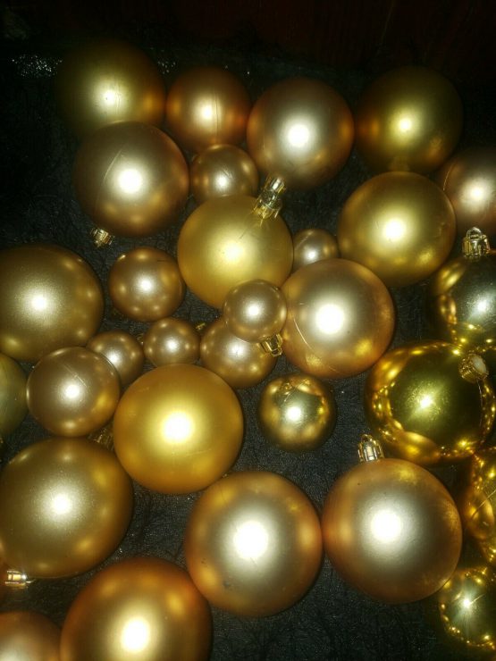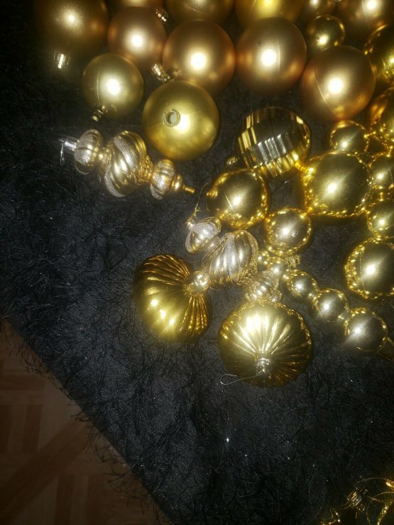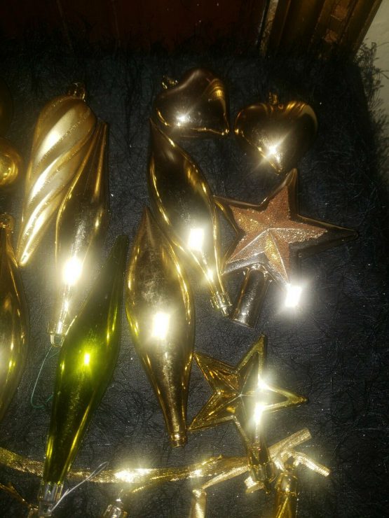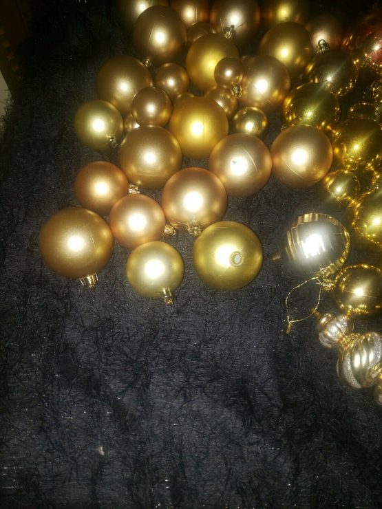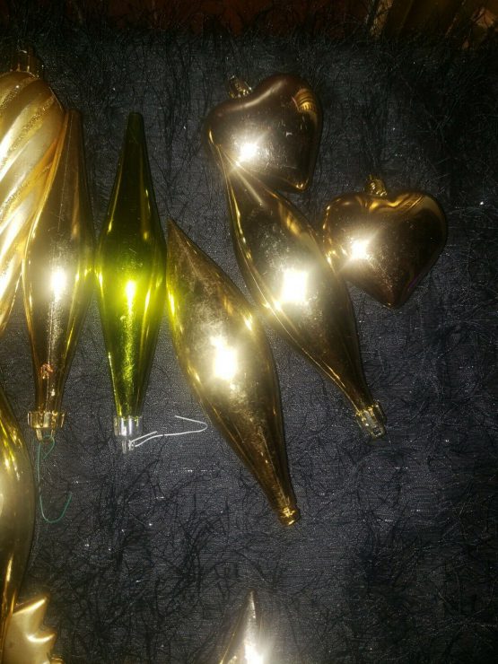 Hi, I am selling Guaranteed Authentic Large Lot 91+ Gold Colored Christmas Holiday Ornaments Medium & Small Balls, In Excellent Condition. This is a gold colored Christmas balls lot, 91 pieces or more in total. This is a big lot, there’s 32 matte gold. There are also 8 gold star with a gold star topper for a Christmas tree and a Christmas gold tree shape as well in a matte gold. Christmas ornament along with 2 gold hearts and 8 chandelier long pieces, 3 interesting gold balls and two swirly gold balls. That’s why I included so many so there’s a variety to choose from a beautiful lot located in Miami Florida. There are a few that are missing the topper, that’s why I included it in a lot. Please look at all the pictures.