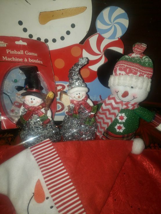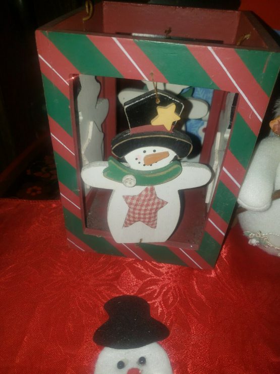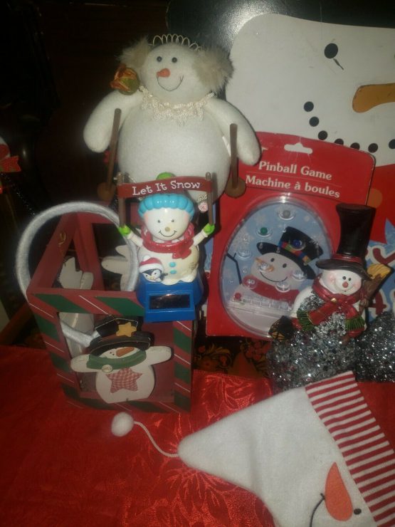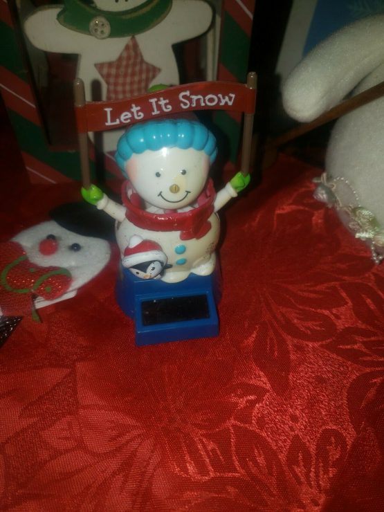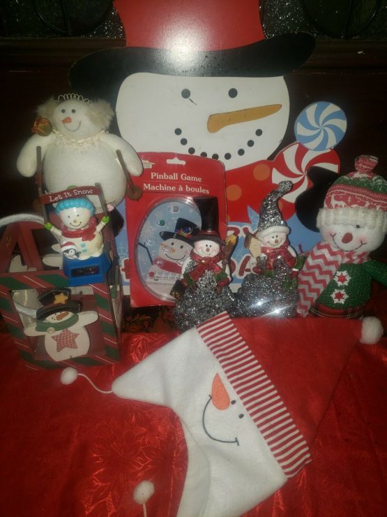 Hi, I am selling Guaranteed Authentic Large Lot of Christmas Holiday Decorations Snow Man Themed, In Excellent Condition. This Snowman lot includes 10 pieces of Snowman Christmas decorations. This Snowman includes a stand for inside or outside big Snowman is a little worn and needs a good cleaning. 2 soft snow man stuffed toys in good condition. A brand new pinball game, a head piece and a snow man hat, along with 2 glittery snow man decorations for the table. Another snowman that could be made out of wood looks like it’s a candle holder, and lastly a  moving snowman, made out of plastic that when the lights is on it moves. Please look at all the pictures.