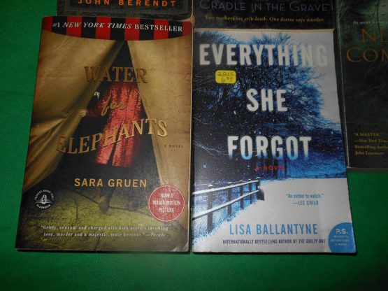 Book titles: Midnight in the Garden of Good and Evil, The Cradle in the Grave, Water for Elephants, Everything She Forgot, Never Come Back