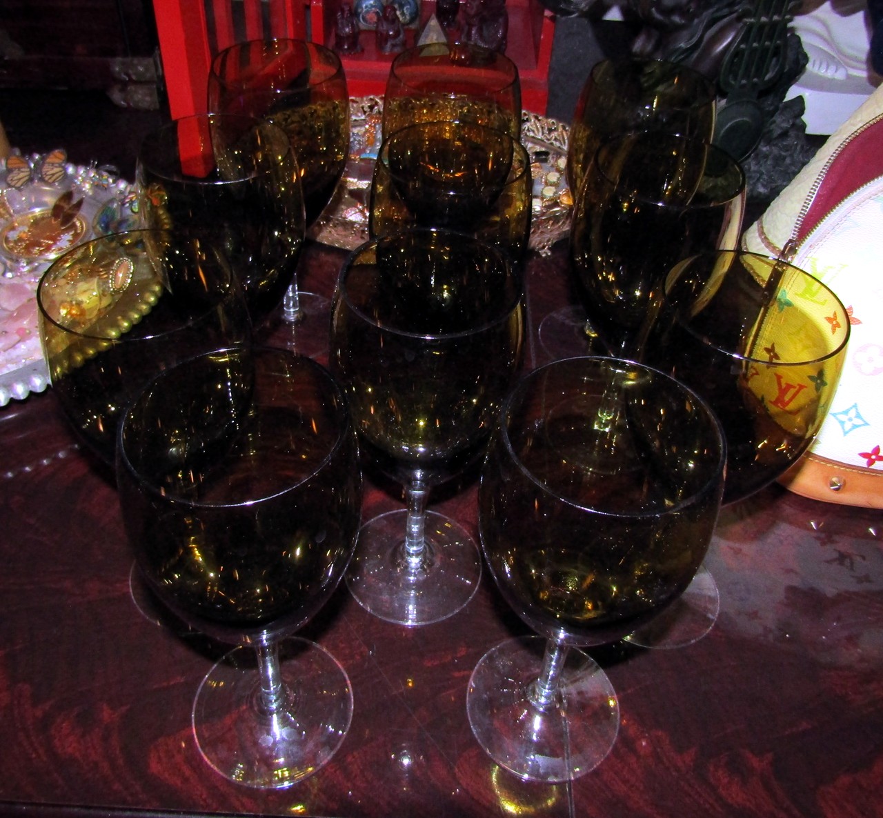 Lot of 11 Tall Oval Wine Drinking Glasses Yellow Amber Color with Short Stem