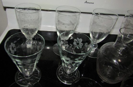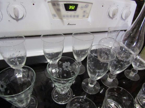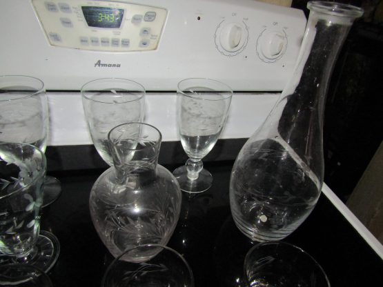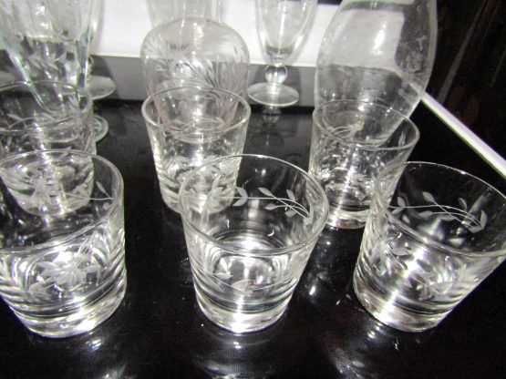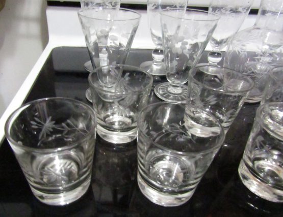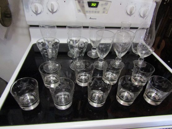Hi, I am selling Guaranteed As Described, Lot of 17 Beautiful Floral Etched Crystal Wine Drinking Glasses & 2 Vases, In Excellent Condition. This Lot of 17 Etched Crystal Wine Drinking Glasses & 2 Vases is a beautiful addition to any home. This set takes elegance and sophistication to the next level. The glasses are made from high quality crystal and their unique etching sets them apart from the rest. The two vases included are perfect complements to the glasses, ensuring a cohesive look.