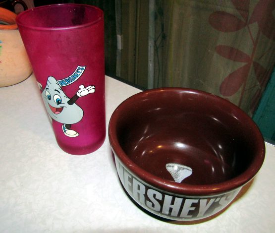Hi, I am selling Guaranteed As Described, Lot of 2 Hershey’s Kisses Themed Red Printed Tall Glass & Brown Cereal Bowl, In Excellent Condition. This is a lot of 2 items Hershey’s Kisses themed, one is a tall red/pinkish glass with a Hershey Kisses printed, the second is a medium sized cereal bowl with Hershey’s printed on the side, and a Kisses inside the bowl.
