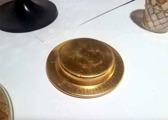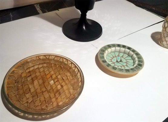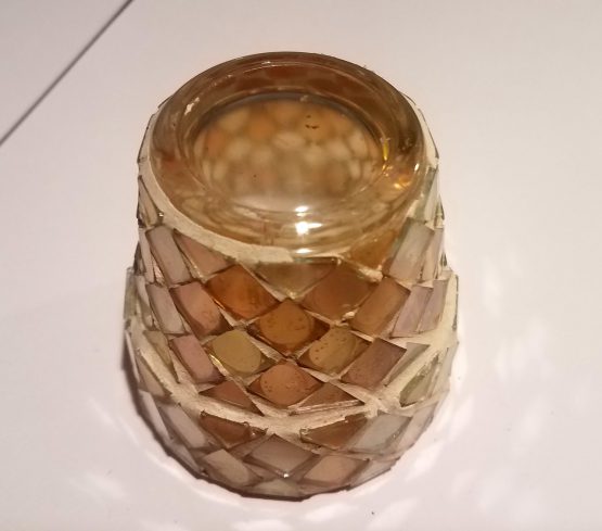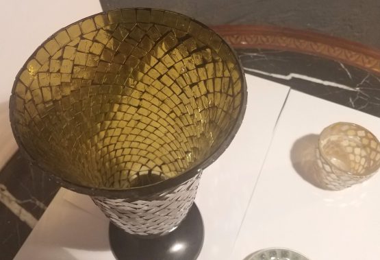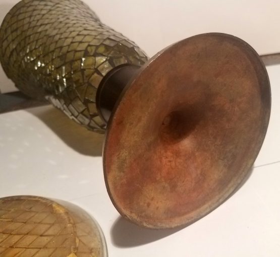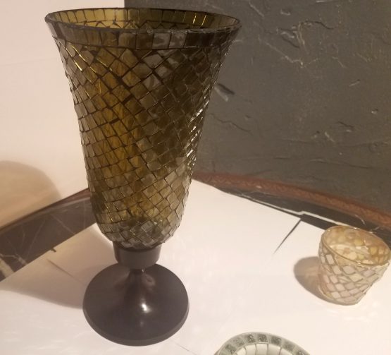 Hi, I am selling a, Guaranteed Authentic Lot of Four Mosaic Glass Decor Vase Candle Holder Copper Plate Cup, in Excellent Condition. this is a beautiful lot of four Mosaic glass themed set. There is a candle holder, with a brass bottom, and green-ish colored translucent mosaic glass. The measurements are 5 1/2″ top diameter, 11 1/4″ tall, 2″ diameter at candle section, and 4 1/2″ bottom diameter. The yellow-ish translucent glass plate is  5 6/8″ in diameter. The small plate is copper and made in japan, is decorated with stones, measures 3 7/8″ in diameter. The cup has translucent mosaic glass, measures 2 3/4″ wide (top) by 2 1/2″ tall. The condition is excellent, they have no noticeable chips or any damages, all pieces are clean and have only been used as display. Please look at all the pictures.