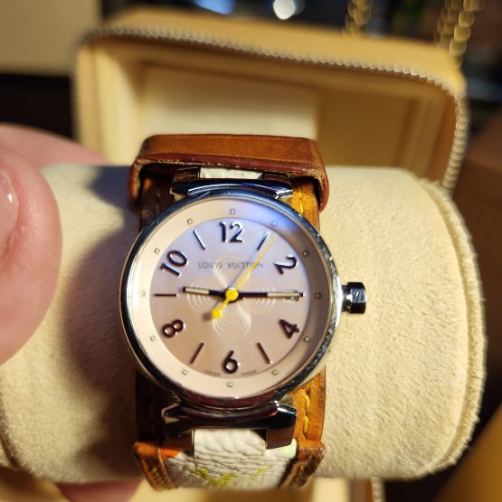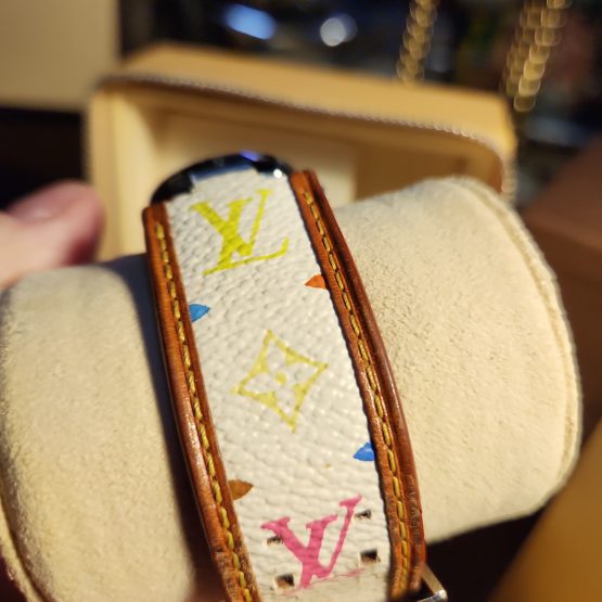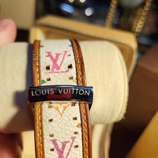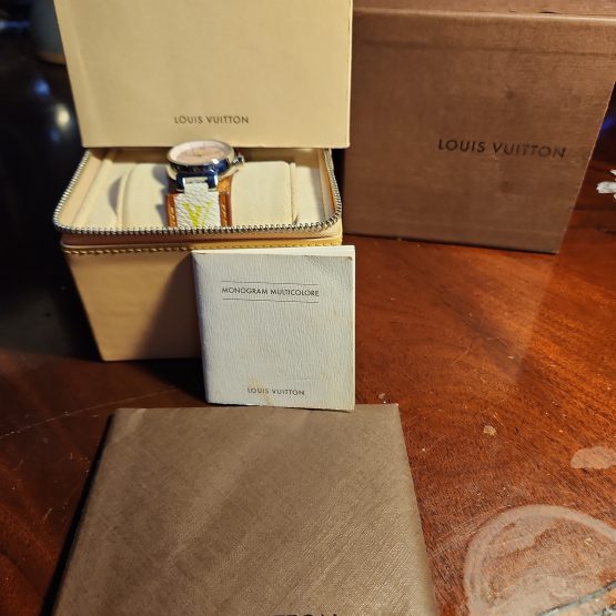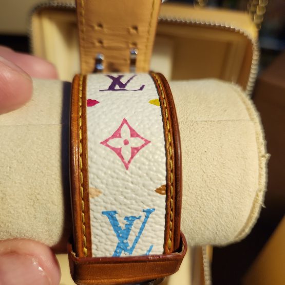 This is an authentic rare Louis Vuitton Watch Q121V Tambour edition, 26mm face, Women’s, with a Pink Mother of Pearl watch face, and a white Multi Color band really beautiful. A great collector’s piece for any Louis Vuitton lover. This beautiful Louis Vuitton watch is lightly used and well taken care of. Includes dust rag, full directions and another set of directions inside the original Louis Vuitton box, manual, signed and stamped warranty card purchased November 6, 2004, and certificate of authenticity.