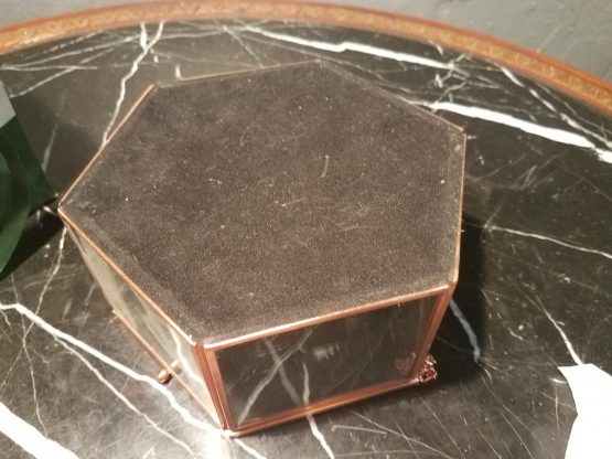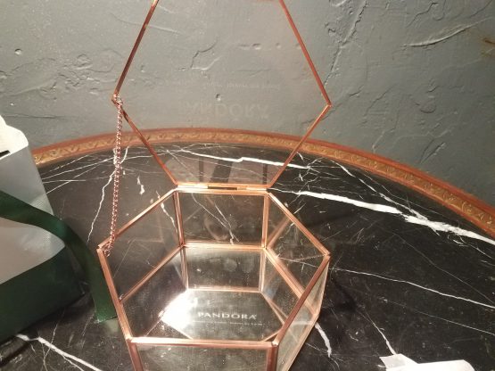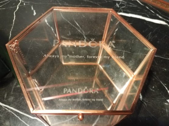 Hi, I am selling Guaranteed Authentic Pandora Gift Box Glass Curio Rare Mothers Day “Always My Mother Forever My Friend”, In Excellent Condition. This is a beautiful gift set that includes a metal with mirror and glass Pandora gift box and Pandora paper handbag and wrapping paper perfect for a Mother’s Day gift. Mid Century Style glass and copper piping, hexagonal glass jewelry box, measuring 6″ x 6″ x 3″. The condition is really excellent, everything is in excellent condition, basically brand-new. Please look at all the pictures.