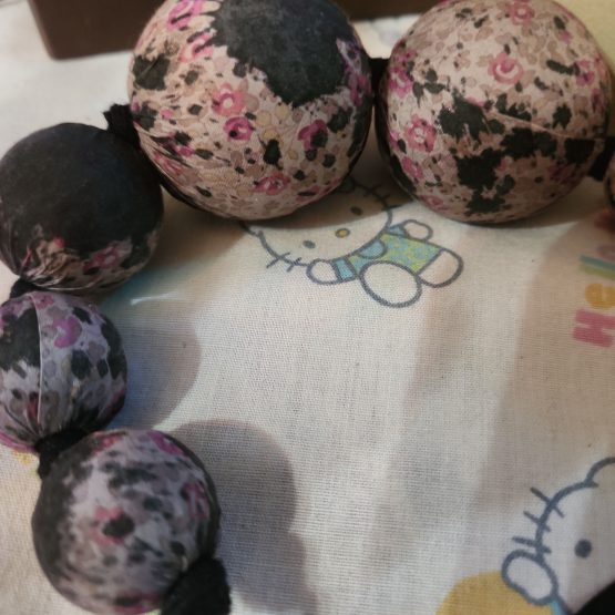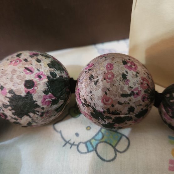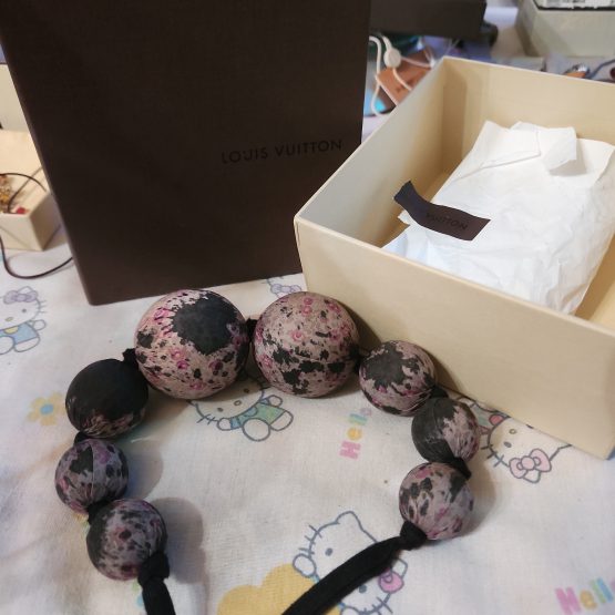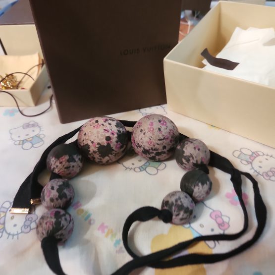 This is a rare authentic necklace from the Louis Vuitton Spring/Summer 2007 runway show. Measuring 58″ long, there are 8 wooden beads covered in Liberty of London fabric, this is the black or dark version more rare then the white one. These fabrics were used in the linings of the Denim Patchwork bags in that collection. The largest bead measures 2″ in diameter and the smallest a little less than 1″ in diameter. They are strung on a cotton cord and knotted between. The endcaps are gold tone and are stamped Louis Vuitton. This necklace is in excellent condition, it is 100% authentic, comes with original box. These are fashion balls with rose motive fabric. Beautiful edition, not worn, and well taken care of, it is one of a kind collector’s piece.