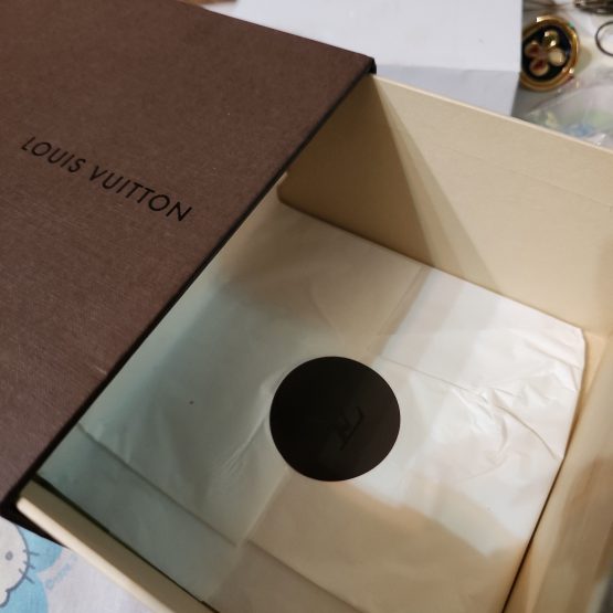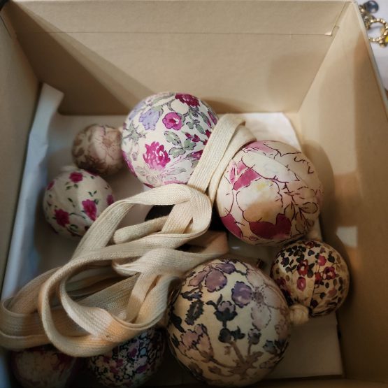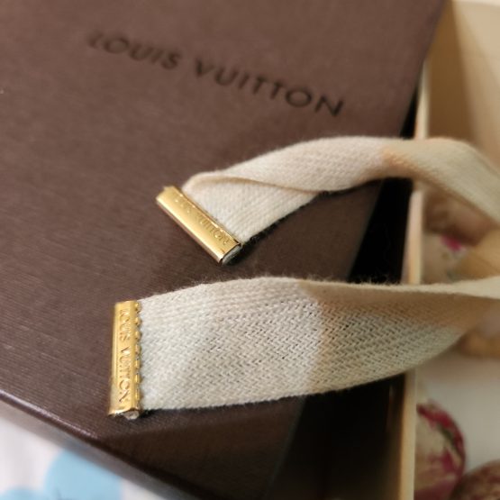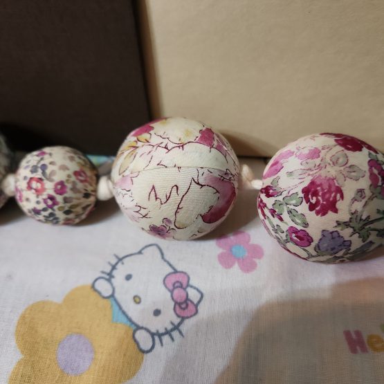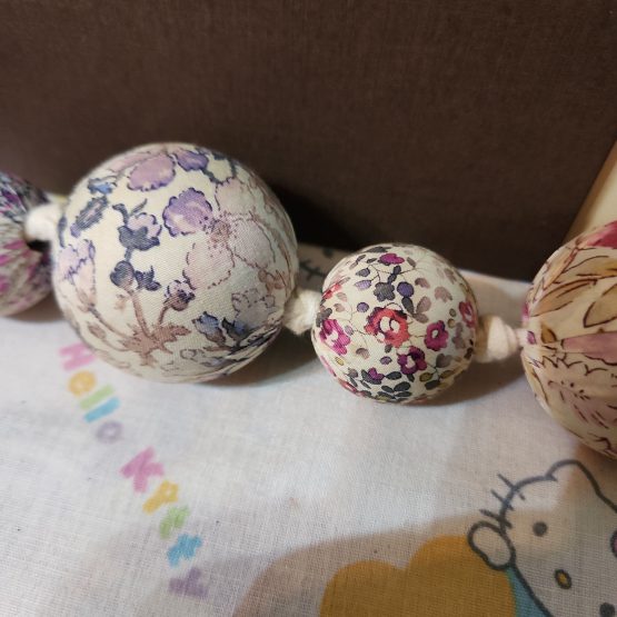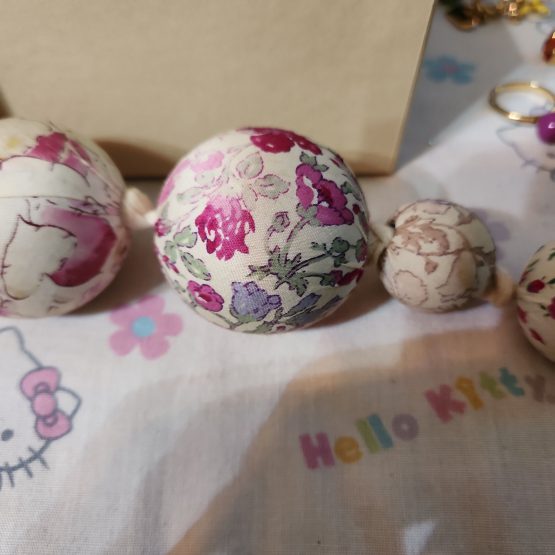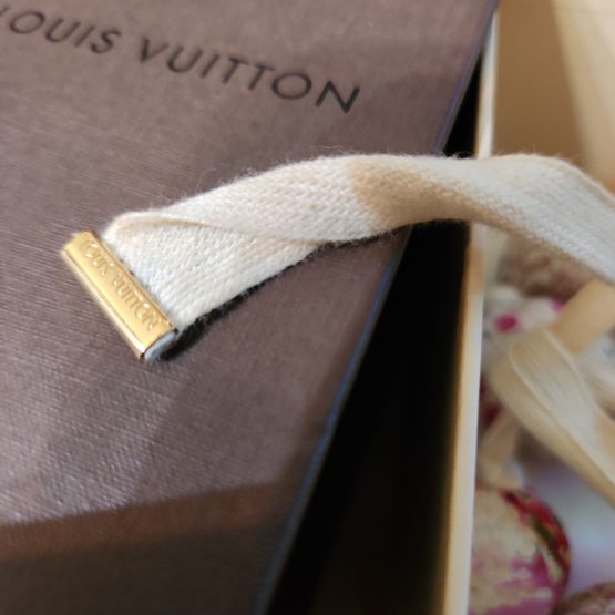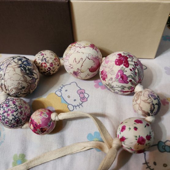 This is a rare authentic necklace from the Louis Vuitton Spring/Summer 2007 runway show. Measuring 58″ long, there are 8 wooden beads covered in Liberty of London fabric. These fabrics were used in the linings of the Denim Patchwork bags in that collection. The largest bead measures 2″ in diameter and the smallest a little less than 1″ in diameter. They are strung on a cotton cord and knotted between. The endcaps are gold tone and are stamped Louis Vuitton. This necklace is in excellent condition, it is 100% authentic, comes with original box and wrap. These fashion balls with rose motive fabric. Beautiful edition, not worn, and well taken care of, it is one of a kind collector’s piece.