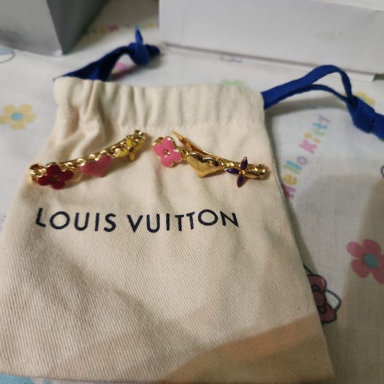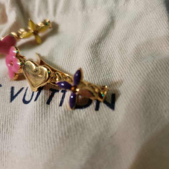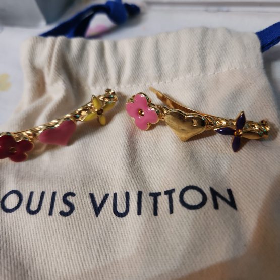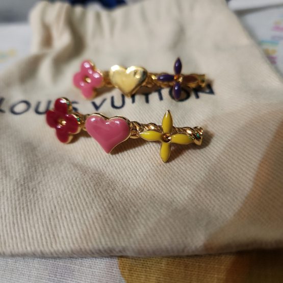 This is an authentic set of LOUIS VUITTON Sweet Monogram Hair Clips. These two barrettes feature brightly enameled symbols from the Louis Vuitton monogram, marked Made in France. Accessorize your look with the iconic appeal and luxury only from Louis Vuitton! One of a kind collector’s piece. These beautiful Louis Vuitton hair clips are lightly used and well taken care of, one leaf is missing the purple enamel, otherwise in excellent condition and just need a good cleaning. Comes with a Louis Vuitton dust bag.