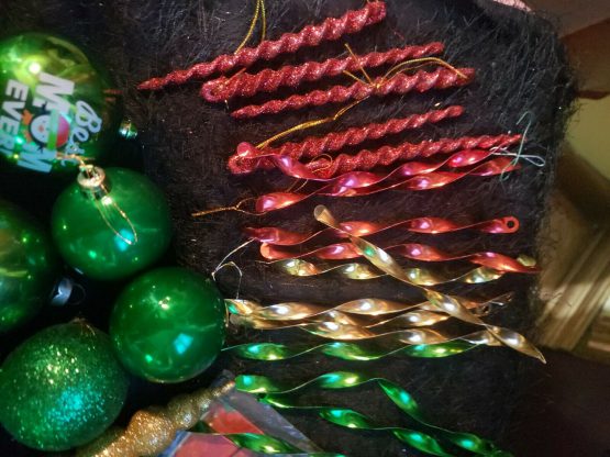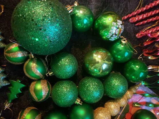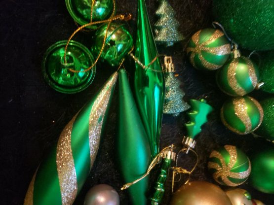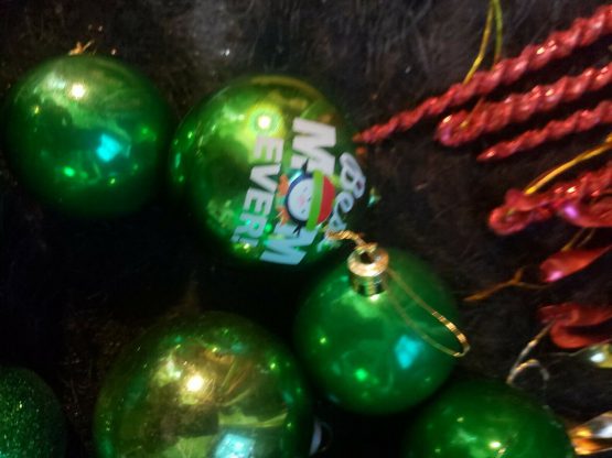 Santa Claus Christmas Decorations Big 60 Lot Items Green Shiny Ornaments Glitter