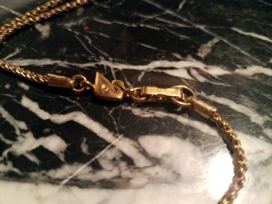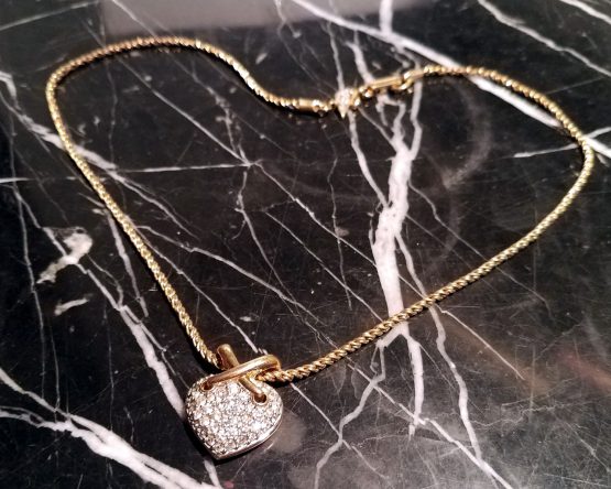 Hi, I am selling a, Guaranteed Authentic Swarovski Swan 18K GP Chain Necklace Pave Crystal Rhinestone Heart Pendant, In Excellent Condition. This is a very cute Swarovski Swan Necklace with Crystal Pave Heart Pendant, made in Austria, and has all the Swarovski hallmark markings. Vintage and hard to find. The Necklace Chain Is 18” Long, and the pendant is 7/8” wide by 1” tall. The condition is in excellent vintage, with minimal wear, some gold plating on the back of the heart pendant that has a little wear, otherwise no damages or anything, looks beautiful. Please look at all the pictures.