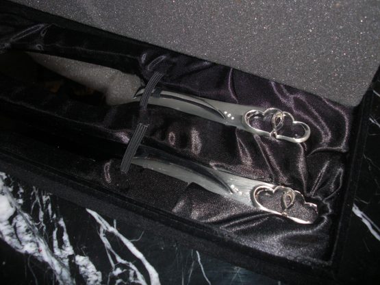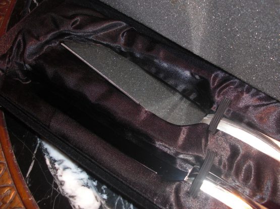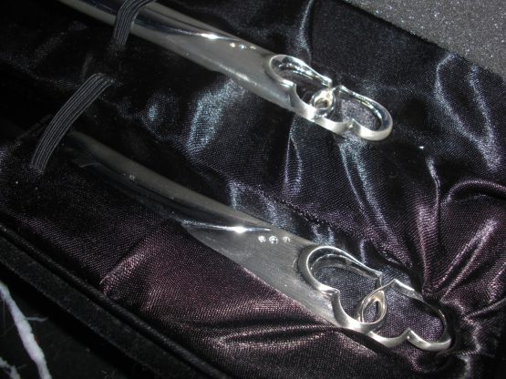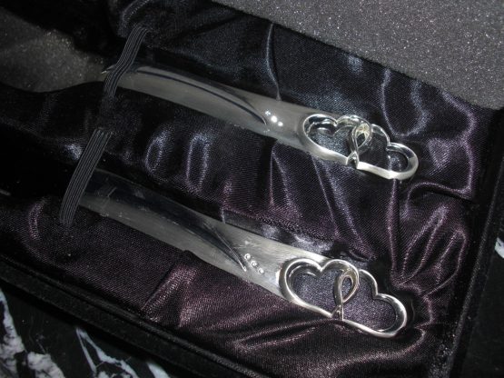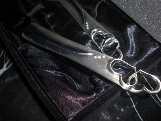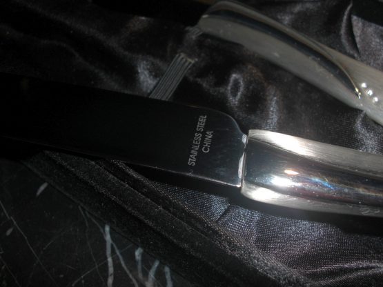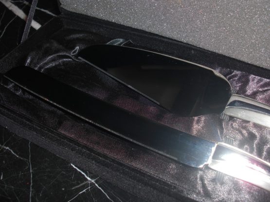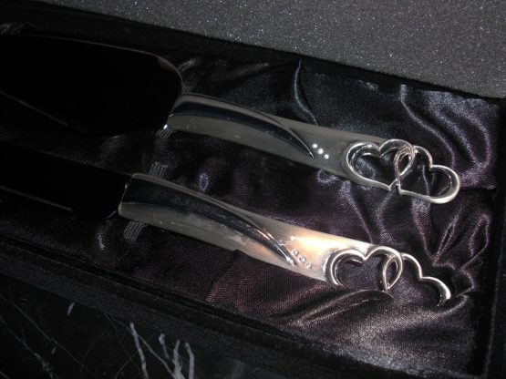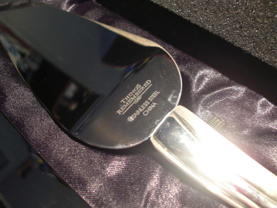 Hi, I am selling a, Guaranteed Authentic Things Remembered Stainless Steel Heart Handle Cake Knife Wedding Serving Set, In Like New in Box Condition. This is a new and never used wedding knife set, comes with the original box. The condition is new, never used, however it has one small noticeable scratch, which occured from handling, otherwise in perfect condition. Please look at all the pictures.