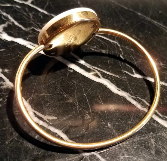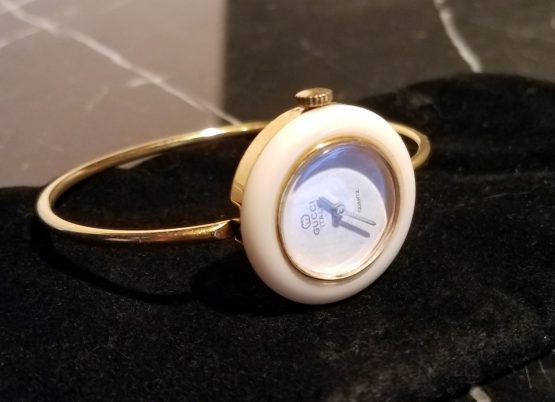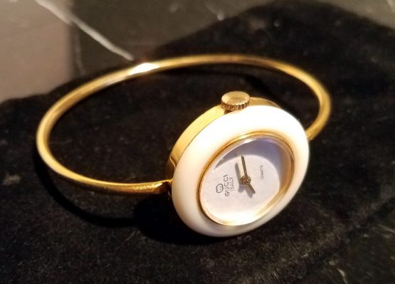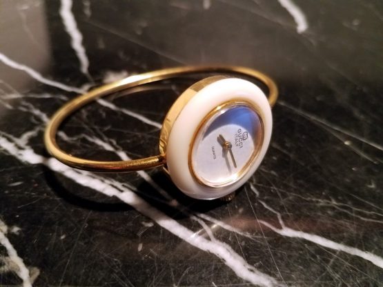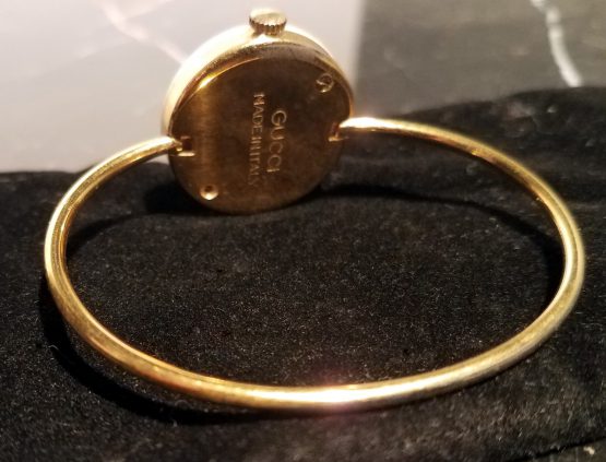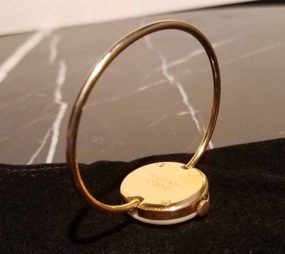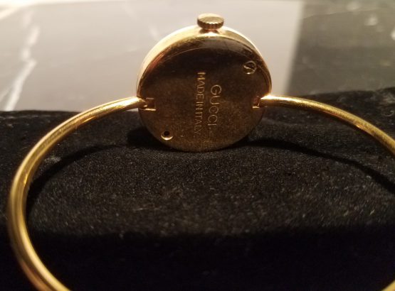 Hi, I am selling a, Guaranteed Authentic Vintage GUCCI Gold Plated Interchangeable Bezels Bangle Ladies Watch Swiss Made, In Excellent Condition. This is a beautiful vintage Gucci watch, really rare, that design is hard to find. This watch has a removable bezel, which can be purchased separately. This model has a bangle which opens on the watch itself. This model has a bangle which opens on the watch itself. The condition is excellent, some minor scratches, the gold is nicely plated and looks great, has a little wear of the gold plating that is noticeable on the back case (pictured), otherwise it is really stunning piece. The watch works, and has a brand-new battery. The back watch case is missing one screw (pictured). Please look at all the pictures.