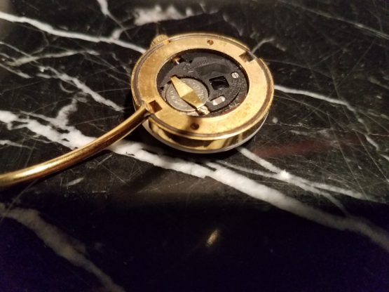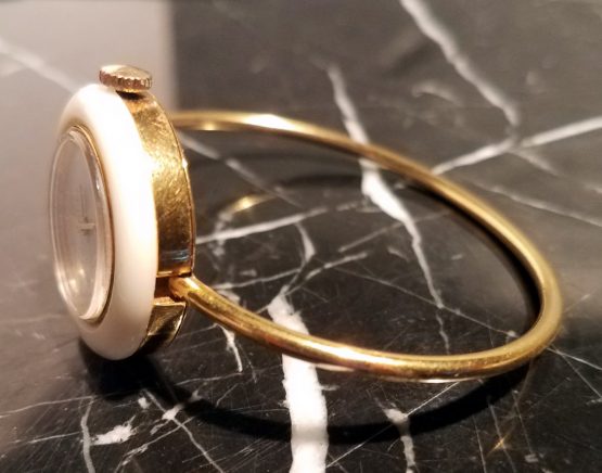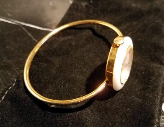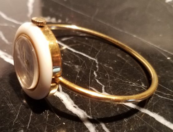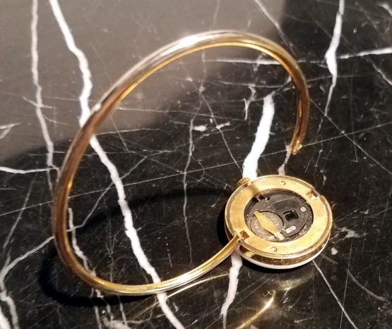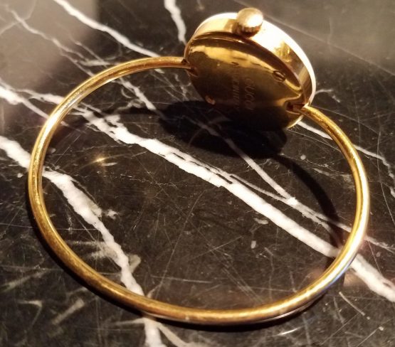 This model has a bangle which opens on the watch itself. The condition is excellent, some minor scratches, the gold is nicely plated and looks great, has a little wear of the gold plating that is noticeable on the back case (pictured), otherwise it is really stunning piece. The watch works, and has a brand-new battery. The back watch case is missing one screw (pictured).